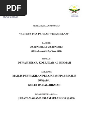 Laman ini menyediakan borang kursus pra perkahwinan berdasarkan modul bersepadu kursus pra perkahwinan islam mbkppi. Kursus kahwin selangor kursus pra perkahwinan yang dilaksanakan bertujuan untuk memberikan maklumat dan pendedahan awal kepada bakal bakal suami isteri yang akan mendirikan rumahtangga. Bahagian undang undang keluarga jais. Shah alam 13 jun 2020 selaras dengan perintah kawalan pergerakan pemulihan pkpp yang berkuatkuasa 10 jun 2020 jabatan agama islam selangor jais akan beroperasi sepenuhnya dan membuka semula semua perkhidmatan kaunter yang ditutup sepanjang perintah kawalan pergerakan pkp dan perkhidmatan mengikut temujanji sepanjang perintah kawalan.