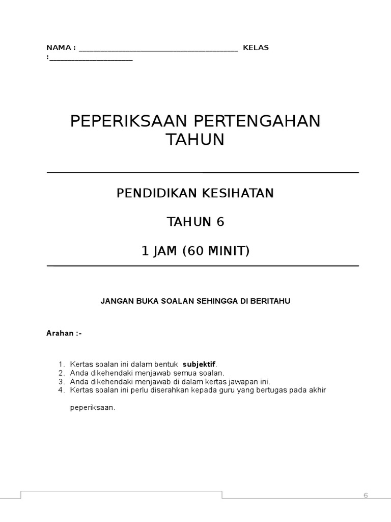 Peperiksaan Pertengahan Tahun Pendidikan Kesihatan Pk Tahun 6