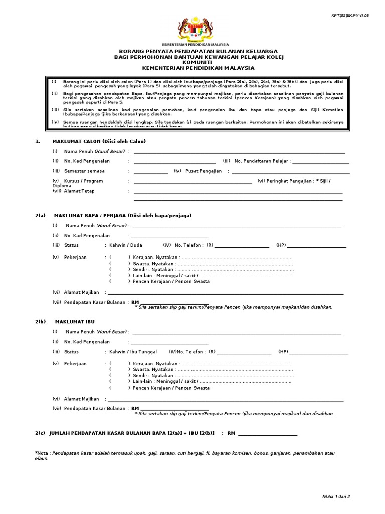 Borang Penyata Pendapatan Bulanan Keluarga Bagi Permohonan Bantuan Kewangan Pelajar Kolej Komuniti Kementerian Pendidikan Malaysia