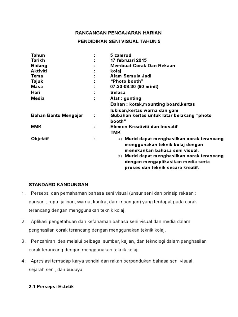 Doc Rancangan Pengajaran Harian Pendidikan Seni Visual Bil Perkara Dyana Nonong Academia Edu
